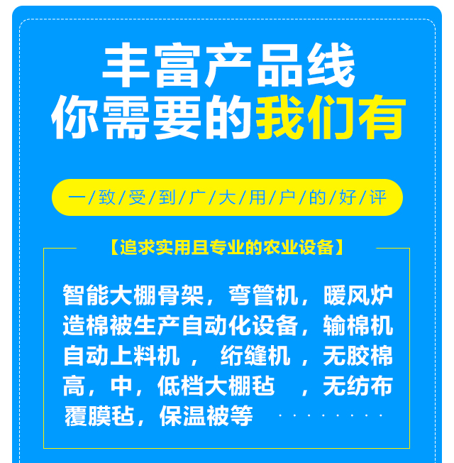 本公司設(shè)備齊全,可生產(chǎn)智能大棚骨架,彎管機(jī),暖風(fēng)爐等農(nóng)業(yè)設(shè)備,另制造棉被生產(chǎn)自動化設(shè)備,自動上料機(jī),輸棉機(jī),絎縫機(jī)等。質(zhì)量可靠,注重創(chuàng)新。公司擁有雄厚的實力,先進(jìn)的生產(chǎn)線,豐富的經(jīng)驗,可根據(jù)客戶的要求定做高,中,低檔大棚氈,無紡布,無膠棉,覆膜氈,保溫被等,車間日生產(chǎn)新型棉被10000平方米以上,能滿足各種客戶的需求,新型保溫被產(chǎn)品在國內(nèi)研發(fā)中始終保持在前列。